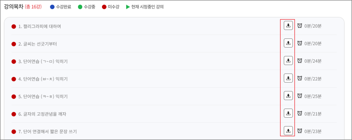 강의목차에서 각 차시 별 교안을 다운로드 받을 수 있습니다.
