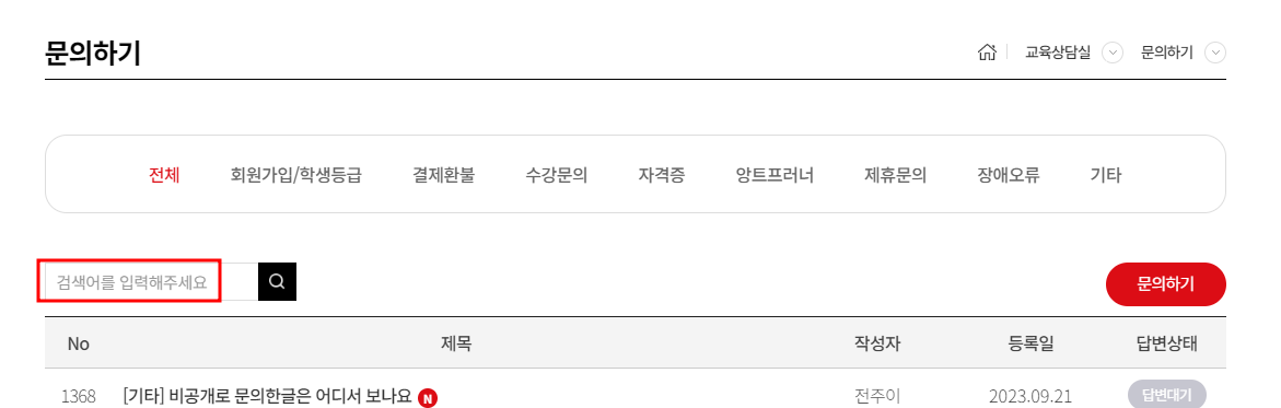 문의하기 게시판에 선생님의 성함을 검색해주시면
